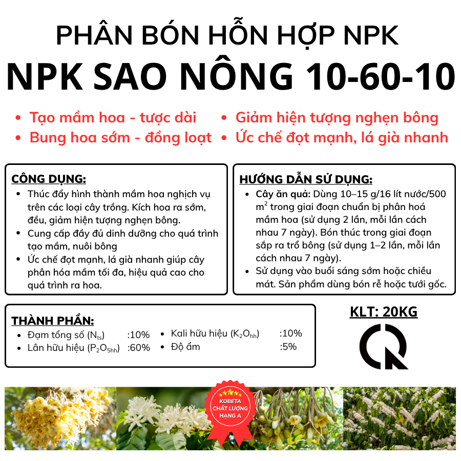 Beta Win NPK 10-60-10 - Phân Bón Hỗn Hợp NPK Bao 20kg là dòng phân bón cao cấp chuyên dùng trong giai đoạn phân hóa mầm hoa và kích ra hoa đồng loạt.