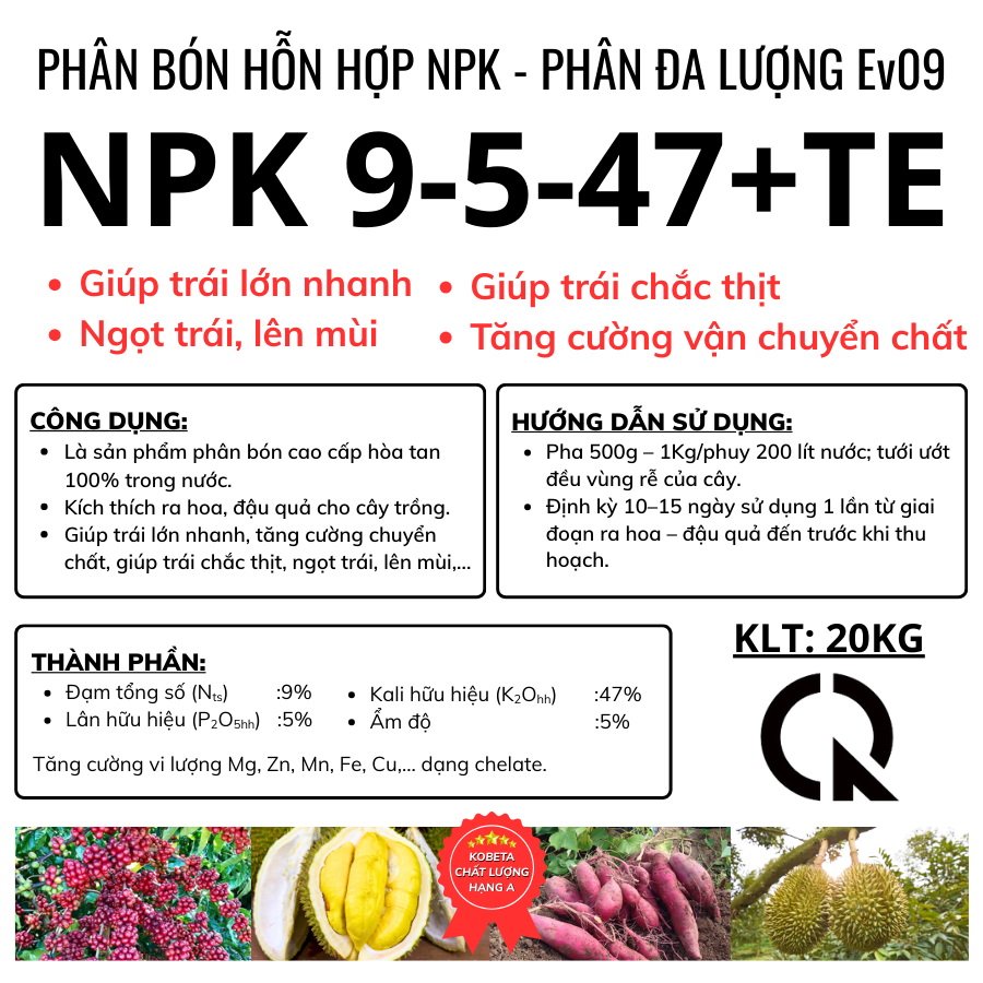 Beta Win NPK 9-5-47+TE - Phân Bón Hỗn Hợp NPK - Phân Đa Lượng Ev09 Bao 20kg là dòng phân bón NPK cao cấp chuyên dùng trong giai đoạn nuôi trái – phát triển chất lượng nông sản. Với hàm lượng Kali cao (47%) kết hợp vi lượng chelate dễ hấp thu, sản phẩm giúp cây tăng năng suất, nâng cao chất lượng và vị ngọt tự nhiên của trái.